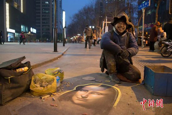 2016年1月4號晚,一名滁州叉車司機(jī)在南京長江路逛街時,發(fā)現(xiàn)很多人圍在路邊駐足觀看,還有人在照相,上前一看,原來是一名“粉筆畫大叔”在作畫。