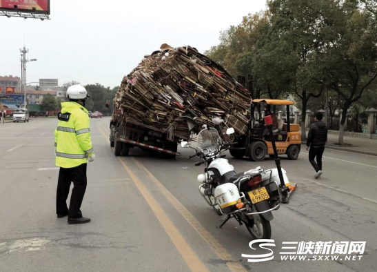此時(shí),一輛小型南京叉車碰巧從該路段經(jīng)過,見到這一情況后,叉車駕駛員便主動(dòng)駕車試圖扶正紙箱。由于功率不足,南京叉車僅能保證貨物不進(jìn)一步傾斜,卻無力將 貨物扶正(如圖)。這時(shí),當(dāng)陽交警玉陽中隊(duì)巡邏民警路過發(fā)現(xiàn)情況后,聯(lián)系施救車輛到現(xiàn)場(chǎng)進(jìn)行救援,并要求貨車駕駛員迅速聯(lián)系其他貨車,將超載的紙箱按規(guī)定 裝載后轉(zhuǎn)運(yùn)。